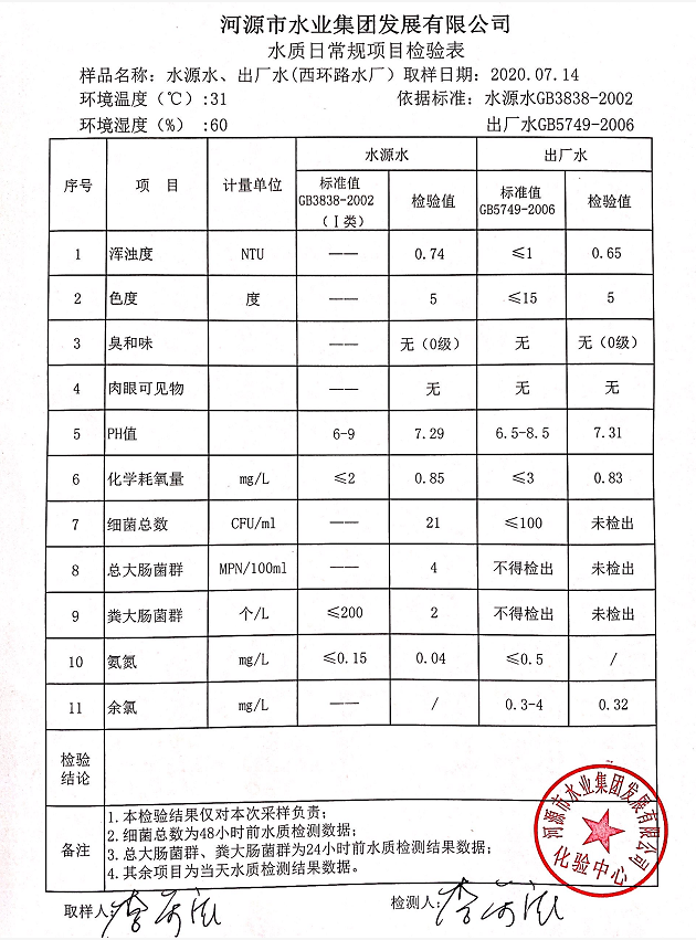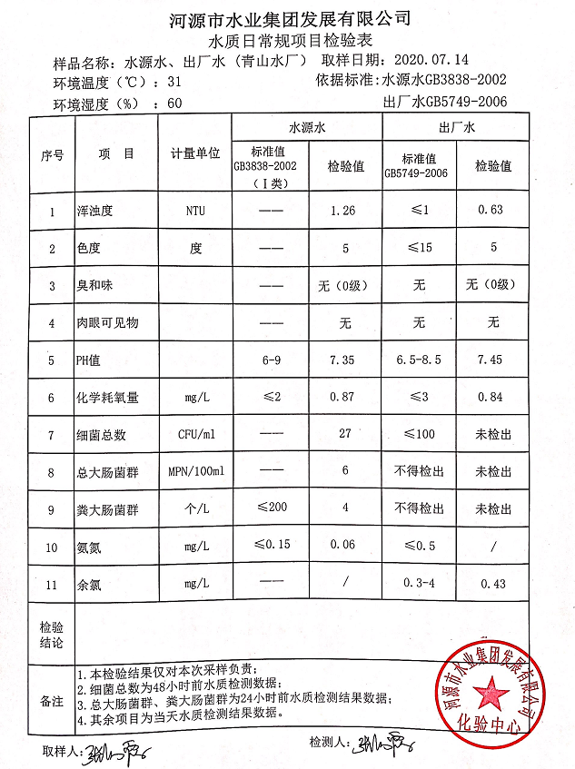 2020年7月14日水質(zhì)檢驗報告