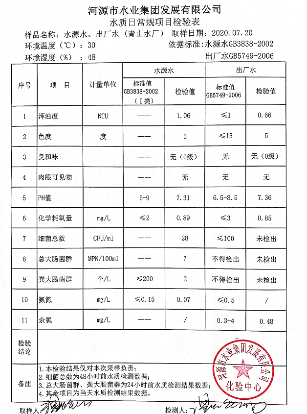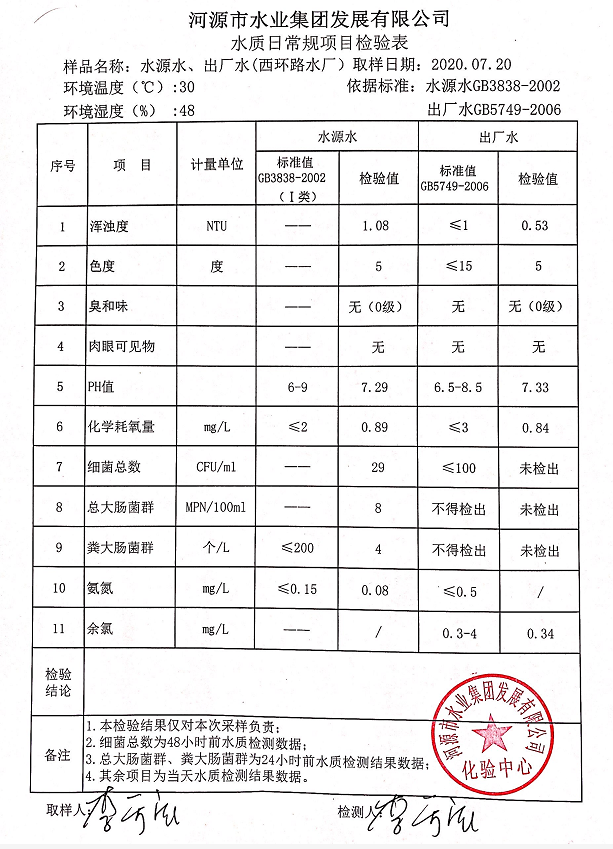 2020年7月20日水質(zhì)檢驗報告
