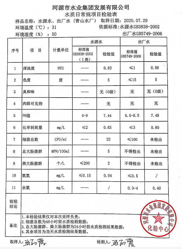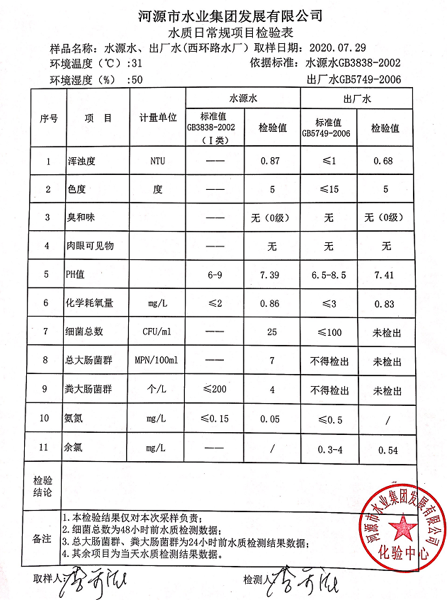 2020年7月29日水質(zhì)檢驗報告