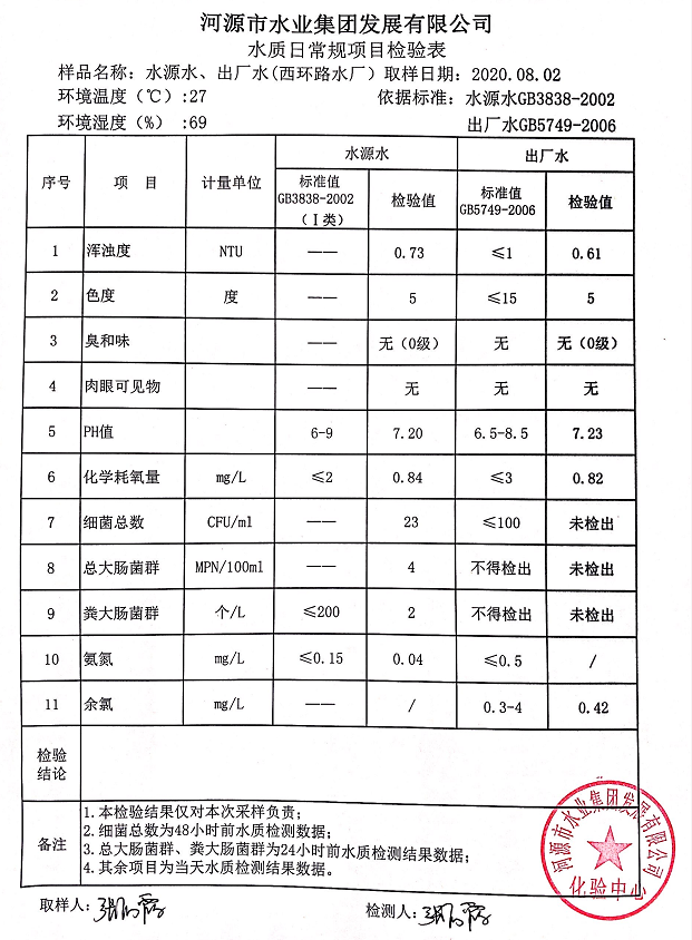2020年8月2日水質(zhì)檢驗報告