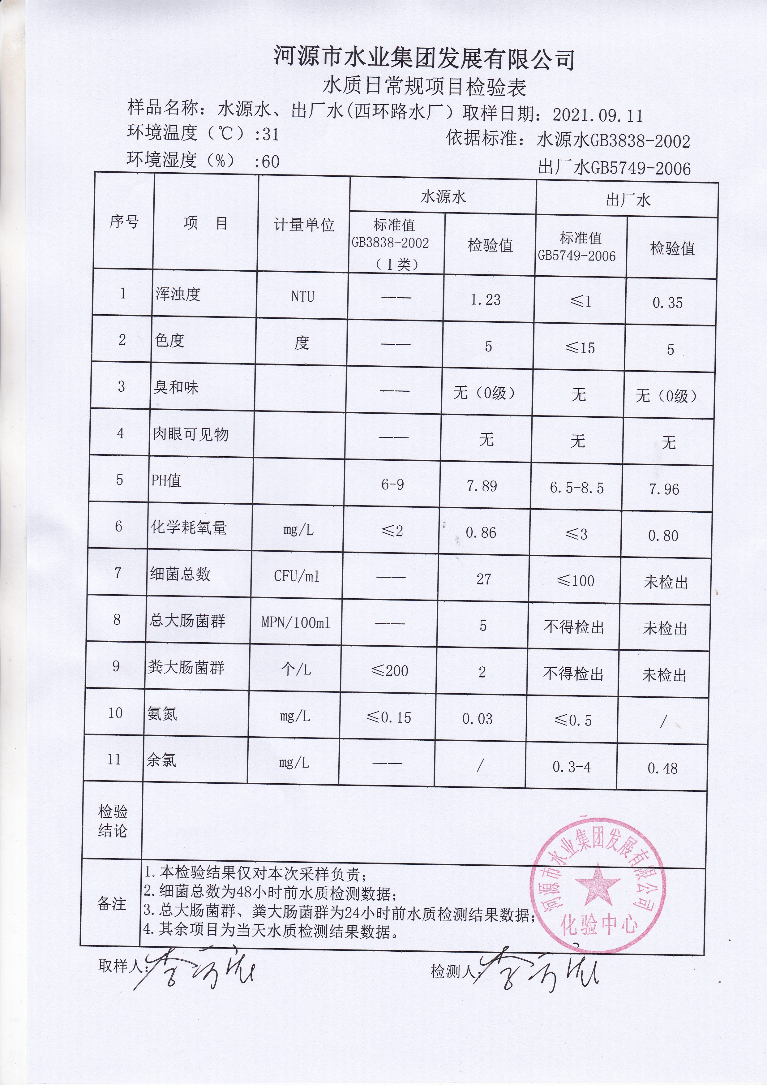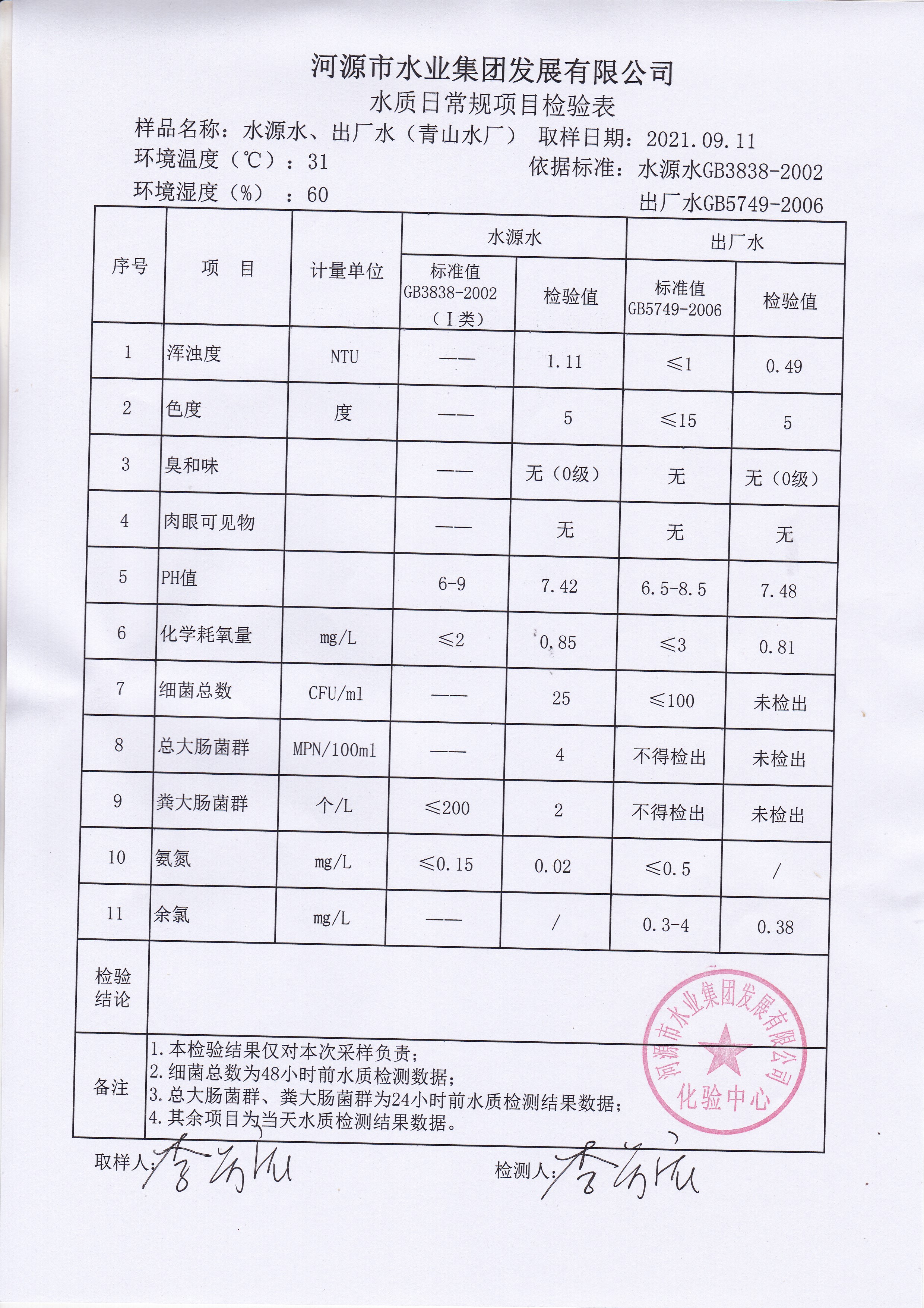 2021年9月11日水質(zhì)檢驗報告 ??