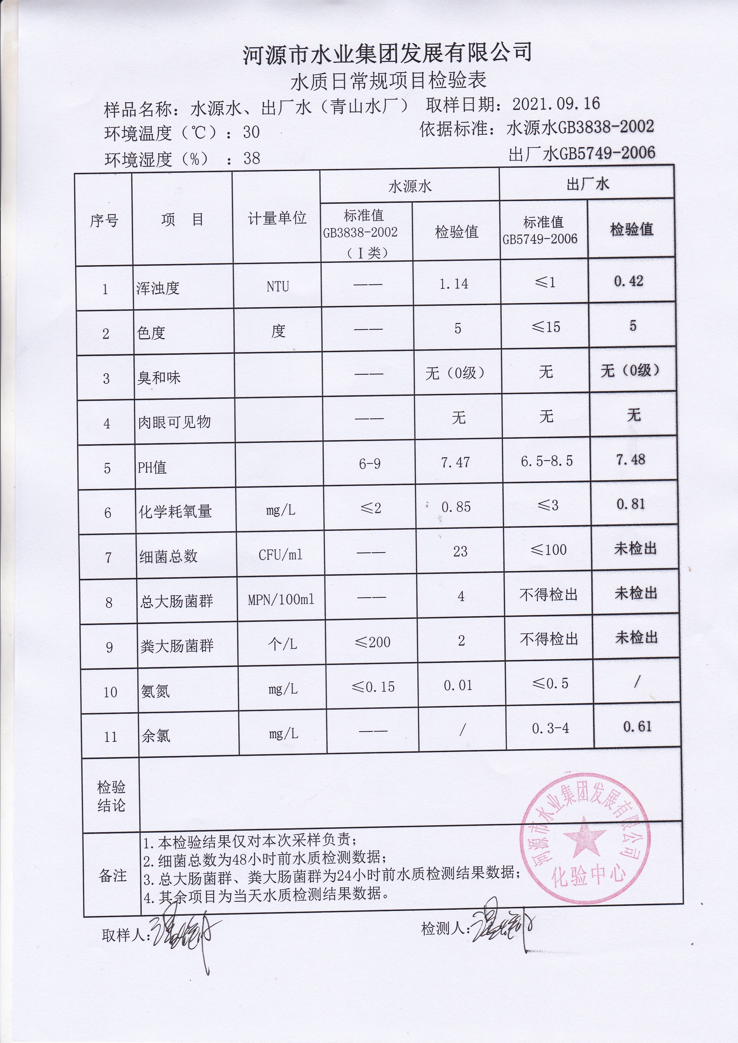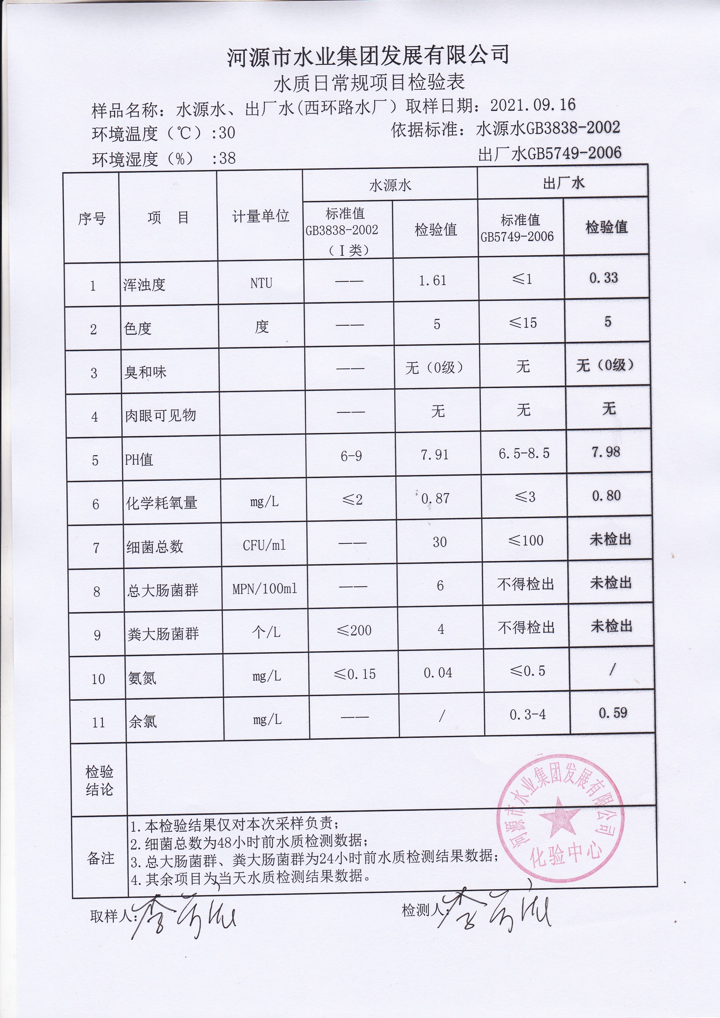 2021年9月16日水質(zhì)檢驗報告 ??