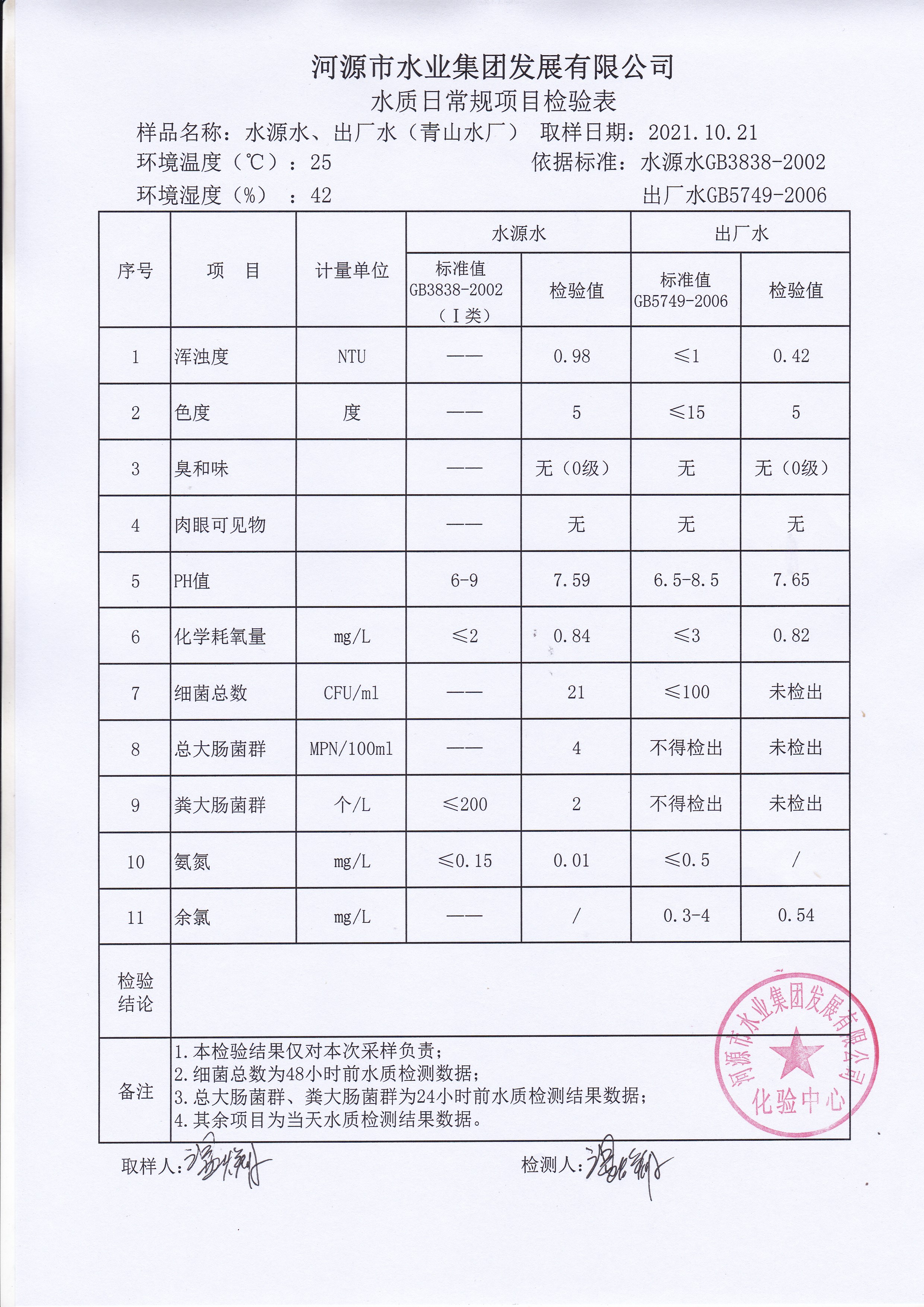 2021年10月21日水質(zhì)檢驗報告