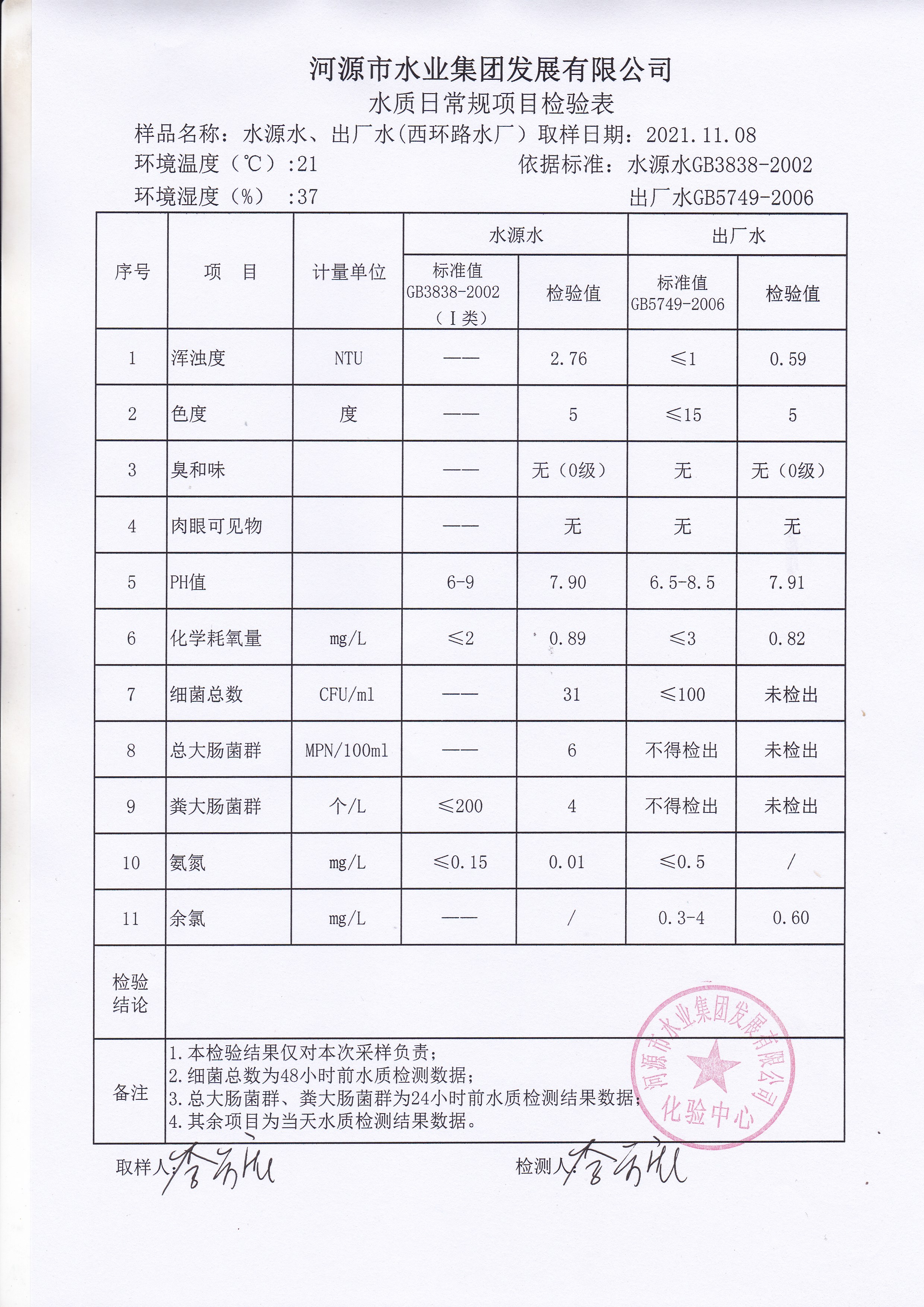2021年11月8日水質(zhì)檢驗報告
