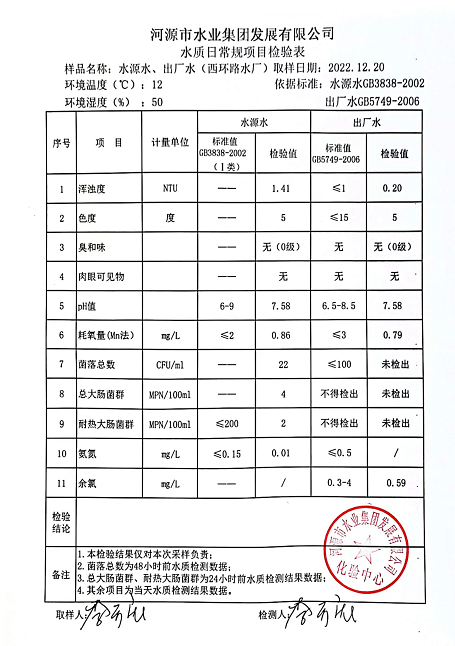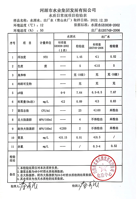 2022年12月20日水質(zhì)檢驗報告
